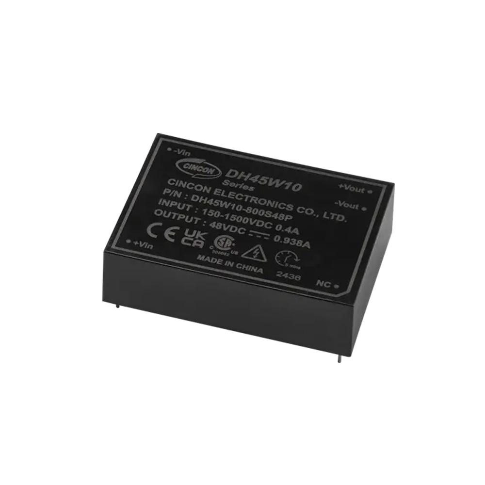 The DH45W10 Series are 45W isolated dc-dc converters with a unique 10:1 ultra-wide input range of 150-1500V dc, ideal for renewable energy, industrial, and high-voltage dc systems. Outputs from 12-48V provide regulated, low-ripple power at efficiencies up to 90%. Featuring 4000Vac isolation, full protection (OCP, OVP, UVLO, SCP), and reverse polarity protection, they are compliant with MIL-STD-810F for vibration and shock. Operating from -40°C to +80°C with derating, they support high altitude up to 5000m. Certifications include UL1741, CSA-C22.2, and EN62109-1.