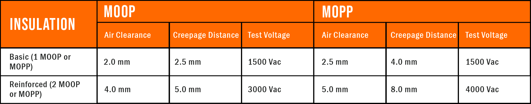 The concepts of Means of Protection (MOP) are critical in the design and certification of medical power supplies. MOPs are categorised into Means of Operator Protection (MOOP) and Means of Patient Protection (MOPP). MOOP focuses on the safety of the device operators, while MOPP is concerned with the safety of the patients. Devices designed with 2 x MOPP are considered to offer a higher level of protection, suitable for direct patient contact, reflecting stricter insulation and separation requirements.
